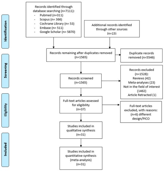 Of the 7126 total results identified, 5546 records were duplicates, so 1565 underwent title and abstract screening to see if they met the inclusion criteria (Figure 1). Of these, 38 were then excluded according to the inclusion and exclusion criteria. Of the 37 articles screened, 31 were finally selected (Figure 1). In total, 31 studies, including 13,627 participants, were included in the quantitative synthesis and network meta-analysis (Figure 1) [5,25,26,27,28,29,30,31,32,33,34,35,36,37,38,39,40,41,42,43,44,45,46,47,48,49,50,51,52,53,54].
