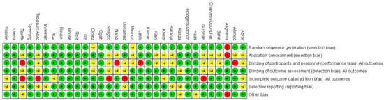 Figure 2 displays the methodological quality of each trial, and a summary of the quality of methodologies, expressed in percentages across all trials, is represented in Figure 3. The majority of the research included presented a low risk of bias. Data about random sequence generation were reported for 28 out of 31 trials.