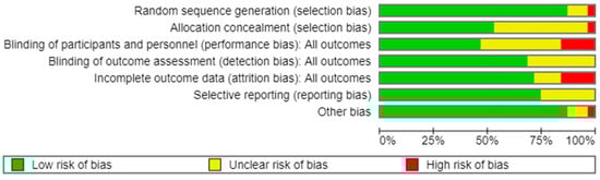 The assessment of the risk of bias in every study included was conducted in accordance with the standards delineated in the Cochrane Handbook for Systematic Reviews of Interventions [24]. Each included trial underwent a critical examination of the following seven domains, as it became apparent that these concerns were associated with biased estimates of the effects of treatments: (1) random sequence generation; (2) allocation concealment; (3) the blinding of participants and personnel; (4) the blinding of outcome assessment; (5) incomplete outcome data; (6) selective reporting, and (7) other bias. The authors classified the evaluation of their judgements as having a “low risk”, a “high risk”, or an “unclear risk” of bias [24]. The risk-of-bias assessment was independently judged by 3 authors (I.I., L.M., C.M.). Disagreement was resolved by discussion with a fourth reviewer (M.L.V.).