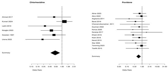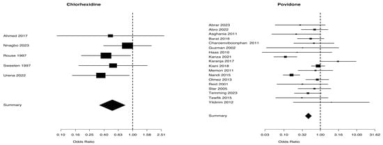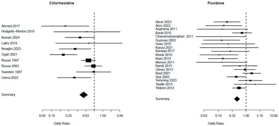 Wound infection from studies [5,25,28,30,31,33] for chlaorhexidine and [35,36,37,38,40,41,43,46,47,48,49,50,51,52] for povidone.