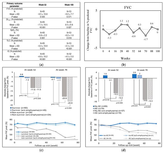 Changes in baseline of primary outcome parameters across the study period in the treated group. (a) Annual changes from baseline for the primary lung function parameters, (i) FVC, (ii) DLCO, (iii) SpO2, (iv) TLC, and (v) IC, as measured through spirometry. (b) Changes in percent predicted FVC from baseline. (c) Predicted mean and absolute FVC changes in survivors and non-survivors, treated with antifibrotic drugs, and (d) predicted mean and absolute FVC changes in treated patients experiencing versus not experiencing at least one acute exacerbation, stratified by emphysema status. AE, acute exacerbation; DLCO, diffusion of carbon monoxide in lungs; FVC, forced vital capacity; IC, inspiratory capacity; SpO2, oxygen saturation; pred, predicted; TLC, total lung capacity.