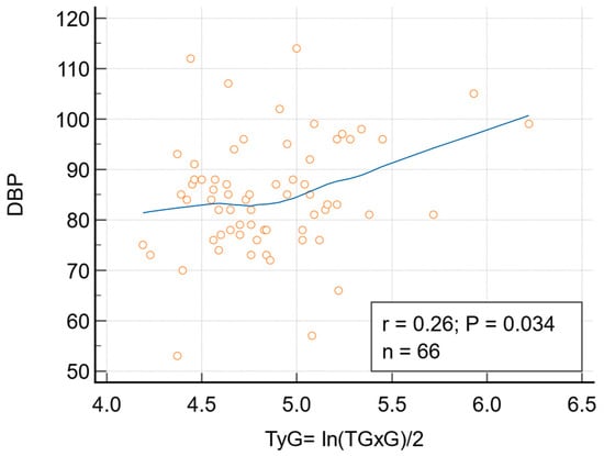 Bravais-Pearson correlations between pulse wave analysis variables and serum lipids and ratios revealed significant correlations only for DBP with TC, non-HDL, and TyG (Table 2). The correlation between DBP and total cholesterol (TC) was significant (r = 0.25, p = 0.042), but the significance was lost after adjusting for lipid-lowering drugs (LLD) (r = 0.2238, p = 0.0731). The correlation between DBP (log) and non-HDL cholesterol (log) was also statistically significant (r = 0.27, p = 0.026, 95% Confidence interval for r: 0.03372 to 0.4836). The correlation remained significant after adjusting for lipid-lowering drugs (LLD) (r = 0.2503, p = 0.044) and BMI and age (r = 0.267, p = 0.032). The correlation between DBP and TyG was statistically significant (r = 0.26, p = 0.034, 95% Confidence interval for r: 0.02100 to 0.4737). The correlation remained significant after adjusting for LLD (r = 0 0.2670, p = 0.0316), but lost its significance after adjusting for age and BMI (Figure 1).