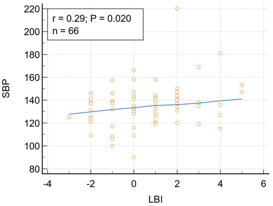 Statistically significant correlations were obtained between pulse wave analysis variables and LBI (Table 3). LBI was significantly correlated with SBP (Figure 2) and DBP. The correlation SBP-LBI remained significant after adjusting for age and BMI (r = 0.274, p = 0.0285), but the correlation DBP-LBI lost its significance after adjusting for the same confounders (r = 0.22, p = 0.08). Rank correlation revealed also a significant relationship between SBP and LBI, as follows: Spearman’s coefficient of rank correlation (rho) = 0.263, p = 0.0331, 95% Confidence Interval for rho: 0.0221 to 0.475 and Kendall’s Tau rK = 0.188, p = 0.0259, 95% Confidence Interval for Tau = 0.0252 to 0.337 (Table 4).