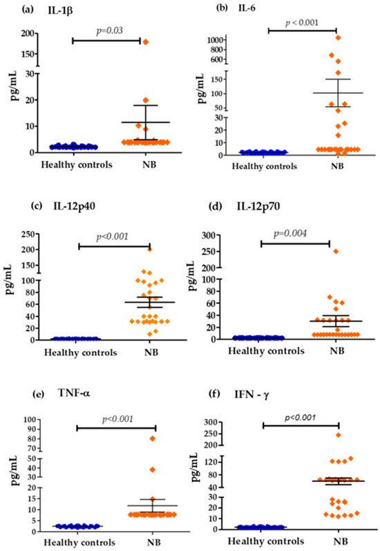 Serum concentrations of pro-inflammatory cytokines in the control group and patients with NB: (a) Differences in IL-1β concentrations (cut-off values; Low Levels ≤ 3.4 pg/mL—High Levels > 3.4 pg/mL), (b) Differences in IL-6 concentrations (cut-off values; Low Levels ≤ 7 pg/mL—High Levels > 7 pg/mL), (c) Differences in IL-12p40 concentrations (cut-off values; Low Levels ≤ 41 pg/mL—High Levels > 41 pg/mL), (d) Differences in IL-12p70 concentrations (cut-off values; Low Levels ≤ 65 pg/mL—High Levels > 65 pg/mL), (e) Differences in TNF-α concentrations (cut-off values; Low Levels ≤ 10 pg/mL—High Levels > 10 pg/mL), (f) Differences in IFN-ɤ concentrations (cut-off values; Low Levels ≤ 20 pg/mL—High Levels > 20 pg/mL).
