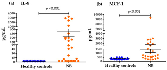 Serum concentrations of IL-8 and MCP1 chemokine groups: (a) Differences in IL-8 concentrations in pg/mL for the control group and patients with NB (cut-off values; Low Levels ≤ 40 pg/mL—High Levels > 40 pg/mL). (b) Differences in MCP1 concentrations in pg/mL for the control group and patients with NB (cut-off values; Low Levels ≤ 1000 pg/mL—High Levels > 1000 pg/mL).