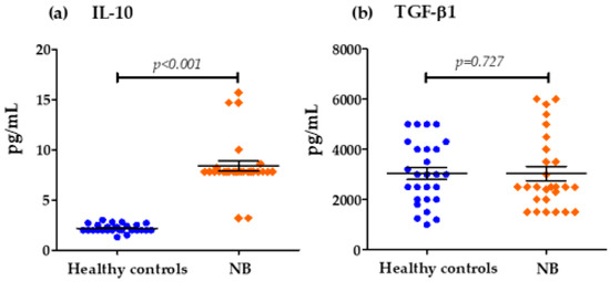 Serum concentrations of IL-10 and TGF-β chemokines groups: (a) Differences in IL-10 concentrations in pg/mL for the control group and patients with NB (cut-off values; Low Levels ≤ 8 pg/mL—High Levels > 8 pg/mL), (b) Differences in TGF-β concentrations in pg/mL for the control group and patients with NB (cut-off values; Low Levels ≤ 5000 pg/mL—High Levels > 5000 pg/mL).