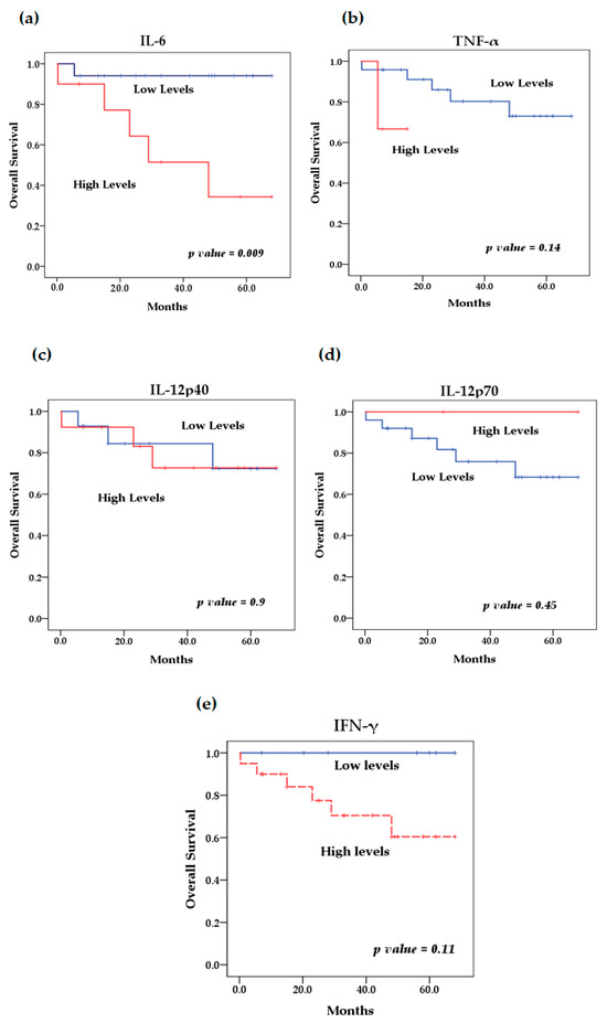 Kaplan–Meier curves comparing patients with high levels to those with low levels of pro-inflammatory cytokines: (a) IL-6, (b) TNF-α, (c) IL-12p40, (d) IL-12p70, (e) IFN-γ.