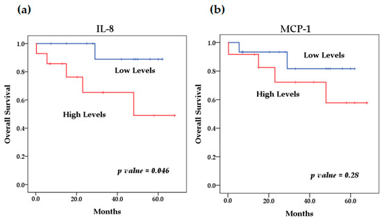 Kaplan–Meier curves comparing patients with high levels to those with low levels of chemokines: (a) IL-8, (b) MCP-1.