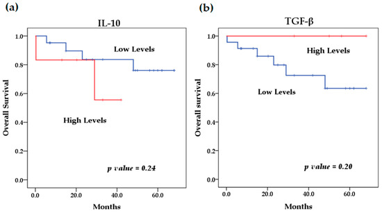 Kaplan–Meier curves comparing patients with high levels to those with low levels of anti-inflammatory cytokines: (a) IL-10, (b) TGF-β.