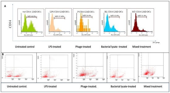 CD14 expression analysis of dendritic cells following various treatments: (A) representative histograms showing CD14 expression percentages in untreated (control), LPS-treated, bacterial-lysate-treated, phage-treated, and bacterial-lysate plus phage-treated DCs; (B) representative dot plots showing CD14-positive and CD14-negative cells among the treatment groups.