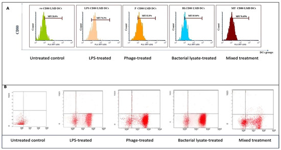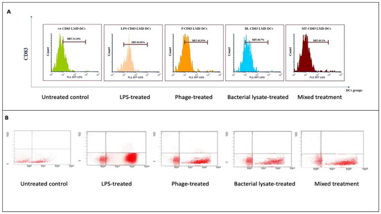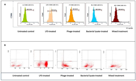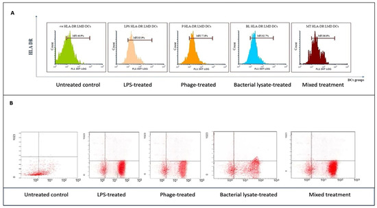 As shown in Figure 4B, HLA-DR markers were lower in the DCs treated with LPSs than in the control group (85.7% compared to 45.6%). Additionally, DCs exposed to bacterial lysate increased HLA-DR expression (80.1%). Phage-treated DCs also showed upregulation (79.9%), while the combination of phage and bacterial lysate resulted in a higher HLA-DR expression (87.4%).