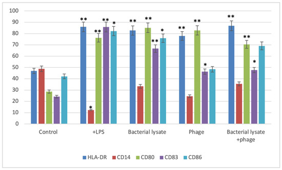 Summary of dendritic cell surface marker expression levels following various treatments. Bars represent the percentage of positive cells expressing HLA-DR, CD14, CD80, CD83, and CD86 in the control, LPS-stimulated, bacterial-lysate-treated, phage-treated, and bacterial-lysate plus phage-treated groups. Data are expressed as the mean ± SD from three independent donors. Statistical significance was determined using one-way ANOVA followed by Tukey’s post hoc test. * p < 0.05 and ** p < 0.01 vs. control group.