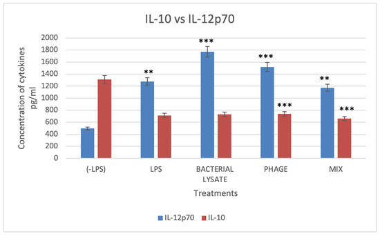 The cytokine IL-10 secretion was measured in DCs stimulated with LPS, phage, bacterial lysate, or a combination of phage and bacterial lysate (Figure 9). Interestingly, DCs treated with bacterial lysate and phage secreted 663.6 ± 51.7 pg/mL of IL-10. In contrast, DCs treated with bacterial lysate alone secreted 733 ± 32.9 pg/mL, while phage-treated DCs secreted 740 ± 25.11 pg/mL. The control group exhibited a significantly higher IL-10 secretion level of 1311.5 ± 69.4 pg/mL. The DCs treated with bacterial lysate, phage, or their combination therapy showed a significant (p < 0.001) reduction in IL-10 secretion (Figure 9).
