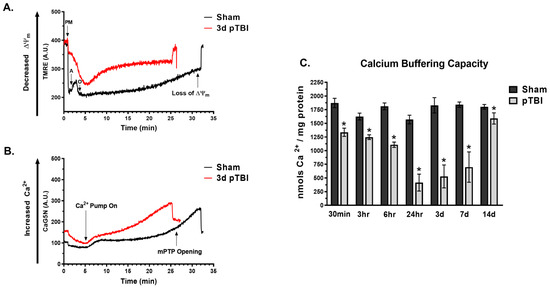 We measured the Ca2+ buffering capacity from FC + ST brain regional mitochondria isolated from the pTBI and Sham cohorts at various post-injury time points. Realtime mitochondrial Ca2+ buffering, ΔΨm, and mPTP opening time were measured at 30 min, 3 h, 6 h, 24 h, 3 days, 7 days, and 14 days post-injury time points (Figure 1). The typical traces of TMRE and CaG5N at 3 days post-injury are illustrated in Figure 1A,B, respectively. The TMRE trace of the Sham group showed a normal pattern of ΔΨm buildup corresponding to the addition of mitochondrial substrates/stressors (e.g., PM, ADP, and Oligo) within 0–5 min intervals. In contrast, pTBI showed an impaired ΔΨm buildup pattern corresponding to the addition of mitochondrial substrates/stressors. At 5 min and onwards, the initiation of Ca2+ infusion illustrated a gradual loss of ΔΨm (i.e., increased TMRE fluorescence) over time in response to mitochondrial Ca2+ uptake (i.e., increased CaG5N fluorescence), respectively, measured until mPTP opening (Figure 1A,B). Overall, the 3 days typical traces of mitochondrial Ca2+ uptake illustrated an increase in CaG5N fluorescence, revealing a low Ca2+ buffering capacity and early mPTP opening between 5 and 35 min in the pTBI group compared to Sham (Figure 1B).
