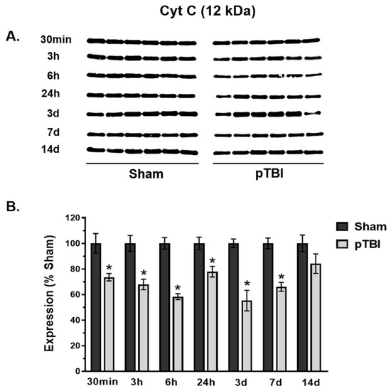 The Cyt C protein band visualized at 12 kDa showed a marked decrease in the pTBI group vs. Sham (Figure 2A). More specifically, the Cyt C protein quantification revealed a significant decrease in its expression in pTBI cohorts, as soon as 30 min to 7 days post-injury (Figure 2B). The Cyt C content was significantly decreased by 23–45% at these acute post-injury time points, where 3 days (45% decreased) showed a maximum loss of membrane integrity protein Cyt C following pTBI. At 14 days, Cyt C showed a non-significant marginal decrease (16% decrease) in pTBI compared to Sham.
