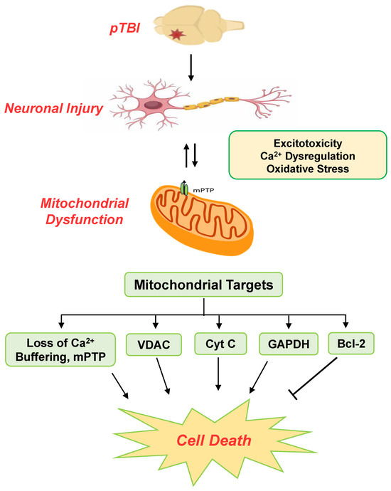 TBI: traumatic brain injury; pTBI: penetrating traumatic brain injury; ΔΨm: Mitochondrial Membrane Potential; Bcl-2: B-Cell Lymphoma 2; GAPDH: Glyceraldehyde 3-Phosphate Dehydrogenase; Cyt C: Cytochrome C; mPTP: Mitochondrial Permeability Transition Pore; VDAC: voltage-dependent anion channel; CaG5N: Calcium Green-5N; TMRE: Tetramethyl Rhodamine Ethyl Ester; Ca2+: calcium.