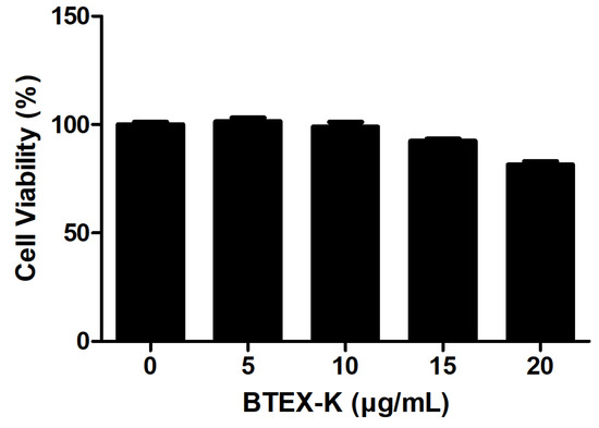 The viability of RAW 264.7 cells in the presence of BTEX-K was measured using the MTT assay as previously described [22]. RAW 264.7 cells (1 × 105 cells/mL) were seeded in 24-well plates for 24 h at 37 °C with 5% CO2. After 24 h, the medium was removed, and cells were treated with scaled concentrations (5, 10, 15, and 20 µg/mL) of BTEX-K for 24 h, after which each well was treated with MTT at 10% of the total volume at 37 °C for 1 h. MTT was aspirated, and the remaining formazan was dissolved in DMSO. Cell viability was measured at 595 nm using an FLx800 microplate reader (BioTek Instruments Inc., Winooski, VT, USA).