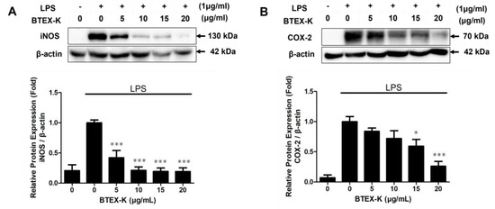 BTEX-K inhibited NO production, which led us to further investigate the expression of iNOS and COX-2 proteins using Western blotting. As shown in Figure 3, LPS substantially increased the protein levels of iNOS and COX-2 after stimulation, whereas cells incubated with BTEX-K exhibited diminished protein levels. The relative densities were 0.42 ± 0.12, 0.21 ± 0.06, 0.19 ± 0.06, and 0.19 ± 0.06 fold for iNOS (Figure 3A) and 0.84 ± 0.05, 0.72 ± 0.13, 0.59 ± 0.11, and 0.26 ± 0.08 fold for COX-2 (Figure 3B) at the concentrations of 5, 10, 15, and 20 µg/mL, respectively. The results indicate that BTEX-K significantly inhibited iNOS and COX-2 protein levels in a dose-dependent manner.