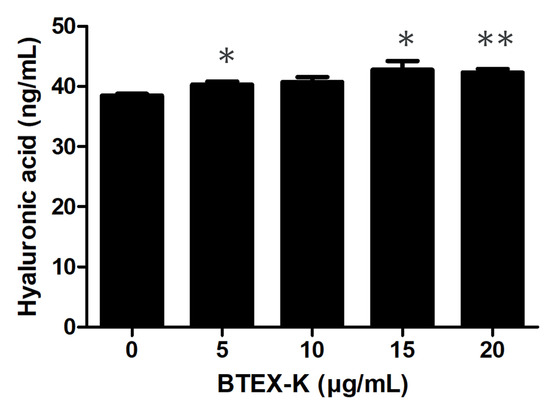The level of HA in the HaCaT cell line culture supernatant with or without BTEX-K was investigated using ELISA. Figure 5 shows that BTEX-K increases the production of HA in the cell supernatant. As can be seen in Figure 5, the produced amount of HA was significantly increased by BTEX-K. The amounts were 40.30 ± 0.52, 40.73 ± 0.83, 42.76 ± 1.45, and 42.33 ± 0.57 ng/mL at the concentrations of 5, 10, 15, and 20 µg/mL, respectively.