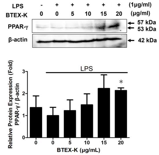 Effects of BTEX-K on protein expression of PPAR-γ in LPS-induced RAW 264.7 cells. Cells were pretreated with BTEX-K for 30 min prior to stimulation with LPS for 18 h. Total cell lysates were extracted and examined via Western blotting. Data from triplicate experiments were quantified by densitometry. Data are expressed as mean ± SEM (n = 4). * p < 0.05 compared with positive control value stimulated by LPS alone.