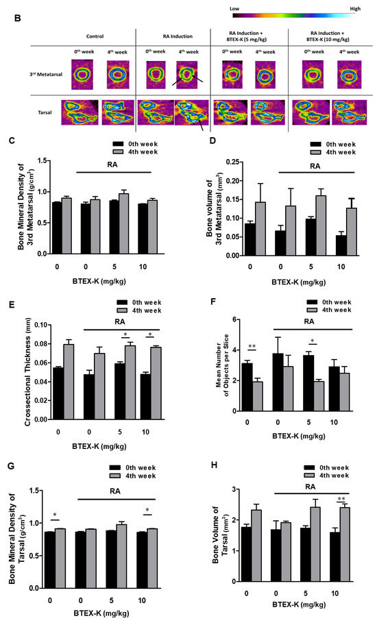 Photographs at week 0 after the induction of rheumatoid arthritis were taken the day after IFA drug injection for RA induction, and photographs at week 4 were taken to understand the morphological changes in BTEX-K over a total of 4 weeks. After 4 weeks, intensive cancellous bone weakness (red circle) was seen in the metatarsal area in RA-induced subjects. However, both BTEX-K treatment groups showed higher bone mineral density and bone volume (blue circle) compared to the RA-induced group (Figure 9A).