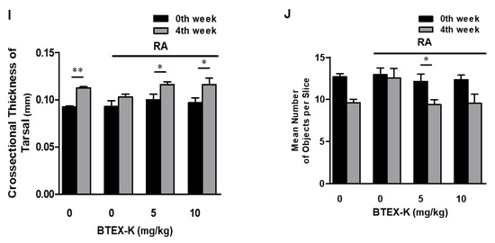 BMD was measured before and after the experiment to measure the amount of bone mineral in bone tissue following the induction of arthritis and the oral administration of BTEX-K. There was no significant difference in BMD regardless of whether arthritis was induced or not and whether BTEX-K was administered (Figure 9C). In Figure 9D, BV is the calculated value of bone volume, and bone volume tended to increase in all groups. However, there was no significant difference in bone volume according to whether arthritis was induced or not and whether BTEX-K was administered. Cross-sectional thickness is an index that refers to the average thickness of a bone cross-section, and no significant change was seen depending on whether or not arthritis was induced. However, cross-sectional thickness was significantly increased in all BTEX-K treatment groups, indicating that the BTEX-K drug is effective in increasing cortical bone thickness (Figure 9E). The mean number of objects per slice refers to the average number of bone segments in cross-sectional images, and when arthritis is induced, the number of segments increases due to a decrease in bone connectivity. Therefore, it was determined that the lower the number of segments, the better the bone condition morphologically. Figure 9F shows that a significant decrease was seen in this value for the control in which arthritis was not induced, and no significant change was seen in the RA induction group. As for the groups with RA induction and administered BTEX-K, only the 5 mg/kg concentration group showed a significant decrease. This suggests that BTEX-K can inhibit the deterioration of bone connectivity that can occur due to arthritis.
