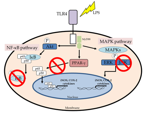 An inflammatory response is a defense mechanism stimulated by physical or chemical damage to tissues or a bacterial infection [2]. In chronic inflammation, the inflammatory reaction and healing process occur simultaneously. Although the inflammatory response is an essential function, long-term inflammatory reactions caused by the uncontrolled or excessive production of inflammatory mediators are harmful and are involved in the development of many diseases, including arthritis, diabetes, cancer, cardiovascular disease, Alzheimer’s disease, atherosclerosis, multiple sclerosis, and nerve damage [3]. Macrophages are pivotal innate immune cells that are involved in the primary defense against pathogen invasion and play an important role in phagocytosis, sterilization, the removal of damaged tissue and aging cells, tissue development and recovery, and antigen information delivery [4,5].