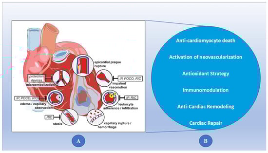 Ischemia reperfusion injury, also termed reperfusion injury, is the paradoxical physiological tissue injury that occurs when blood supply returns to a tissue that had been ischemic for a period of time. This sudden restoration of oxygen and nutrients is the principal cause of this phenomenon, as it can provoke a cascade of inflammatory reactions and oxidative stress. During ischemia, cells undergo metabolic changes in order to deal with the lack of oxygen; when reperfused, the sudden re-entry of oxygen can lead to the generation of ROS and damage to cellular components [8]. Furthermore, reintroduction of the blood flow can cause microvascular injury that includes increased permeability and inflammation caused by white blood cell infiltration into the damaged area and the release of inflammatory mediators. However, each of these factors then contributes to making cells even more dysfunctional and tissue more damaged, further complicating their recovery. The pathophysiology of reperfusion injury was a key step toward the development of therapeutic strategies that may be able to prevent the adverse effects of reperfusion injury in clinical interventions, including organ transplantation and cardiac resuscitation [9]. As illustrated in Figure 1, panel A depicts the pathophysiological mechanisms underlying reperfusion injury, while panel B highlights various therapeutic strategies aimed at mitigating myocardial infarction-related reperfusion injury.