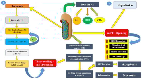 ROS cascade and mPTP opening in myocardial infarction reperfusion injury. (1) Ischemia induces low oxygen tension, which causes metabolism to favor anaerobic glycolysis, leading to lactic acid build-up, cellular acidity, and ionic pump failure. This causes tissue swelling and opening of the mitochondrial permeability transition ore (mPTP). (2) During reperfusion, the abrupt entry of oxygen forms a burst of ROS, leading to mitochondrial membrane depolarization, outer mitochondrial membrane rupture, and additional opening of mPTP. The ultimate outcomes of these events are ATP depletion, inflammation, and the activation of apoptotic and necrotic pathways of cell death.
