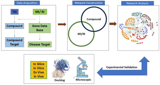 The flowchart of network pharmacology in MIRI. The illustration shows a step-by-step drug discovery workflow with a network pharmacology approach. It starts with data acquisition, in which compound data are obtained based on the traditional system of information (TSI) and modern/recent information (MI/RI), and then compound and disease targets are identified through gene databases. These targets are subsequently incorporated into the construction of the network to determine the shared targets between the compounds and diseases, which is presented in a Venn diagram fashion. The resulting network is thoroughly analyzed so as to identify important molecular interactions and pathways. Lastly, the in silico predicted targets and interactions undergo experimental verification to ascertain their therapeutic context.