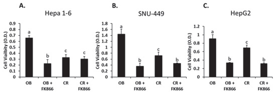 MTT assay used to assess cell viability. Viability was assessed via MTT dye conversion. Hepa 1-6 (A), SNU-449 (B), or HepG2 (C) cells were exposed to the treatments for 72 h. OB = obese sera, FK866 = iNAMPT inhibitor, and CR = control sera. Data shown represent the average of at least three independent experiments. Results were compared using ANOVA followed by Tukey’s post hoc test. Different letters indicate significant differences between experimental conditions; p < 0.05.