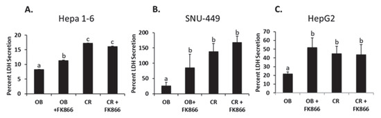 LDH secretion by liver cancer cells exposed to serum. Hepa 1-6 (A), SNU-449 (B), or HepG2 (C) were exposed to treatments in serum free media. OB = obese sera, FK866 = iNAMPT inhibitor, and CR = control sera. Cells remained in treatment for 24 h. Thereafter, an Invitrogen LDH Cytotoxicity Kit was used to assess LDH secretion in the cells following treatments. Different letters indicate significant differences between experimental conditions; p < 0.05.