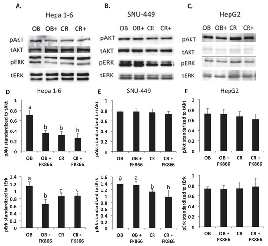 Western blot analysis of kinase phosphorylation in liver cancer cells. Hepa 1-6 (A), SNU-449 (B), or HepG2 (C) cells were seeded at 250,000 cells/well for 24 h. Cells were serum-starved for 24 h and then treated in SFM with 5% OB sera, 5% OB sera + FK866 (iNAMPT inhibitor) 10 nM, 5% CR sera, and 5% CR sera + FK866 10 nM for 1 h. Pixel density was measured to quantify protein levels using imageJ. (D) Hepa 1-6 pixel density of phosphorylated Akt standardized to total Akt and phosphorylated Erk standardized to total Erk. (E) SNU–449 pixel density of phosphorylated Akt standardized to total Akt and phosphorylated Erk standardized to total Erk. (F) HepG2 pixel density of phosphorylated Akt standardized to total Akt and phosphorylated Erk standardized to total Erk. Data shown represent the average of at least three independent experiments. Different letters indicate significant differences between experimental conditions; p < 0.05.