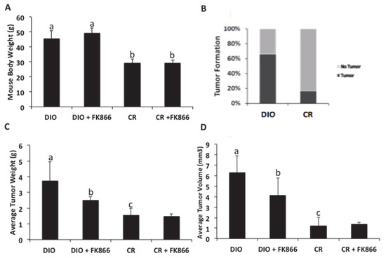 Effects of high-fat diet and FK866 inhibitor on C57/BL6 mice. At 21 weeks, C57/BL6 mice were injected with 500,000 Hepa 1-6 liver cancer cells, and palpable tumors were detected at 23 weeks. (A) Mice were randomized to high-fat diet (DIO) or control (CR) diet for 25 weeks, and final body weights were measured. (B) Tumor incidence was confirmed at the end of the study, with percentages determined from mice randomized to either the DIO or CR group. (C) Tumor weight was measured at the end of the study for each experimental group: DIO (n = 3), DIO + FK866 (n = 4), CR (n = 2), and CR + FK866 (n = 1). (D) Tumor volume was measured for all mice using the following formula to calculate tumor volume: tumor volume = d2 × D/2. Here, d and D represent the shortest and longest diameter in mm, respectively. Different letters indicate significant differences between experimental conditions; p < 0.05.