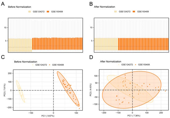 Batch effects removal of GSE124272 and GSE150408. (A) Boxplots of combined dataset distribution before batch removal. (B) Post-batch integrated combined dataset distribution boxplots. (C) PCA plot of the integrated combined dataset before debatching. (D) PCA plot of the integrated combined dataset after debatching.