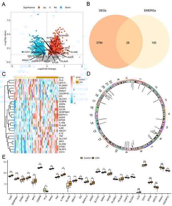 Differential gene expression analysis. (A) Volcano map of DEG analysis between LDH and Control group in the combined dataset. (B) Venn diagram illustrating the overlap between DEGs and EMERGs. (C) Heat map of EMERDEGs in the combined dataset. (D) Chromosomal mapping of EMERDEGs. (E) A comparison chart presents EMERDEGs in the combined dataset (n = 25/group, * p < 0.05, ** p < 0.01 and *** p < 0.001 vs. Control group; ns = not significant (p > 0.05)).