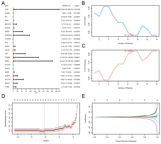 Diagnostic model of LDH. (A) Forest plot lines of significant key genes related to LDH using univariate logistic regression. SVM algorithm to obtain the error rate of the minimum number of genes (B) and the highest accuracy of the number of genes (C). Diagnostic model plot (D) and variable trajectory plot (E) of LASSO regression model.