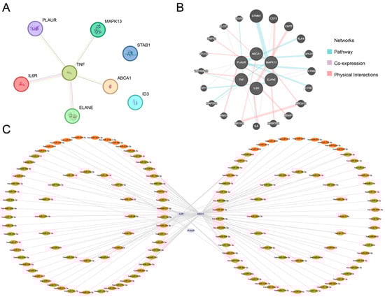 First, the PPI network of the eight key genes was constructed using the STRING database (Figure 5A). The results indicated that six genes—IL6R, TNF, MAPK13, ELANE, PLAUR, and ABCA1—were interconnected. These six genes were defined as hub genes.