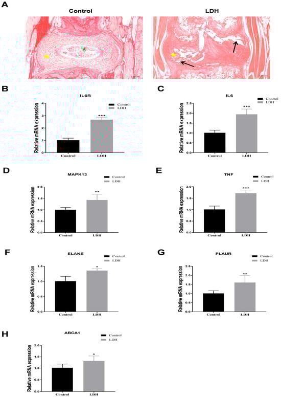 To further validate the important role of hub genes in LDH, we employed the IVD degeneration mouse model. The detection of hub genes showed that, compared to the Control group, the expression of IL6R and its ligand IL6, as well as TNF, MAPK13, ELANE, PLAUR, and ABCA1, was significantly increased in the IVD tissue of the LDH group (Figure 6B–G).