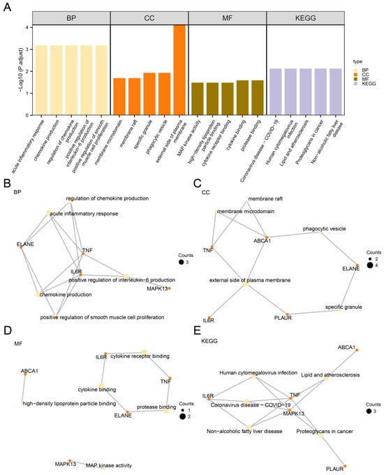 GO and KEGG enrichment analysis for hub genes. (A) Bar chart depicting the results of GO and KEGG pathway enrichment analyses of hub genes, categorized into biological processes (BP), cellular components (CC), molecular functions (MF), and KEGG pathways. The x-axis represents GO and KEGG terms. (B–E) Network diagrams illustrating the GO and KEGG enrichment analysis results for hub genes, with panels corresponding to BP (B), CC (C), MF (D), and KEGG pathways (E). In these networks, light yellow nodes represent enriched terms, orange nodes denote hub genes, the size of the black nodes corresponds to the count value, with larger dots representing higher counts, and connecting lines indicate their relationships. The screening criteria for GO and KEGG enrichment analysis were adj.p < 0.05, FDR value (q value) < 0.235, and the p-value correction method was Benjamini–Hochberg (BH).