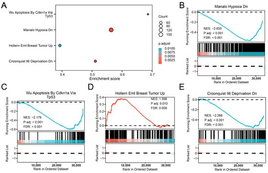 Gene set enrichment analysis. (A) A bubble plot of the GSEA. (B–E) GSEA showed that the combined dataset was significantly enriched in MANALO HYPOXIA DN (B), WU APOPTOSIS BY CDKN1A VIA TP53 (C), HOLLERN EMT BREAST TUMOR UP (D), and CROONQUIST IL6 DEPRIVATION DN (E). The screening criteria of GSEA enrichment screening were adjusted with p-value < 0.05 and FDR value (q-value) < 0.25 as selection thresholds. The Benjamini–Hochberg method was applied for p-value correction.