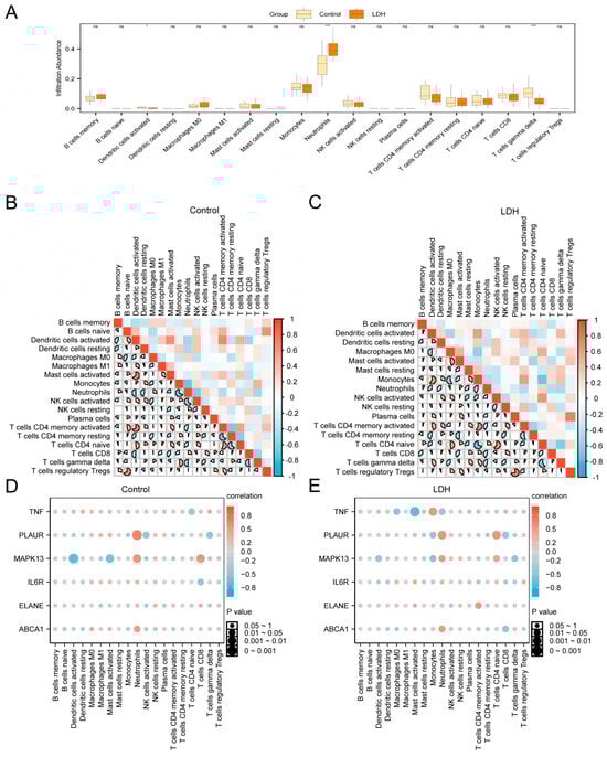 Immune infiltration analysis by CIBERSORT algorithm. (A) Box plots represent comparisons between the LDH group and the Control group in terms of the abundance of different immune cell infiltrates. (B,C) Correlation heatmaps of immune cells in the Control group (B) and LDH group (C) from the combined dataset. (D,E) Bubble plots showing the correlation between immune cell infiltration abundance and hub genes in the LDH group and the Control group from the combined dataset; * represents p-value < 0.05, statistically significant; *** represents p-value < 0.001 and highly statistically significant; ns represents not significant (p > 0.05). The absolute value of the correlation coefficient (r-value) below 0.3 represents weak or no correlation; between 0.3 and 0.5, a weak correlation; between 0.5 and 0.8, a moderate correlation; and above 0.8, a strong correlation. Red shows a positive correlation; blue shows a negative correlation. The depth of the color represents the strength of the correlation.