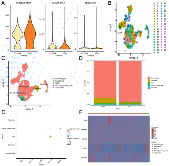 The proportional composition of these cell types in the LDH and Control groups was analyzed and is depicted in Figure 10D. Additionally, a dot plot (Figure 10E) and a heatmap (Figure 10F) were generated to illustrate the expression patterns of hub genes across the five cell types. The GSE230809 dataset contains five hub genes, including IL6R, MAPK13, ELANE, PLAUR, and ABCA1. Analysis of hub gene expression revealed that IL6R, MAPK13, and ELANE were predominantly expressed in chondrocytes, PLAUR exhibited high expression in MSCs, and ABCA1 was relatively highly expressed in smooth muscle cells.