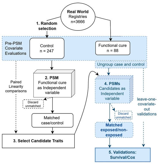 Rounds of PSM were achieved using the R package ‘MatchIt’ (version 4.5.5). To obtain more balanced groups for comparisons, logistic regression modeled the probabilities of receiving the variable of interest, given the sets of covariates. After the initial estimation, a propensity score was calculated for each participant, reflecting the subject’s predicted probability of receiving the intervention of interest (i.e., being treated), based on the prior modeling estimates. The region of common support was examined using these scores. Nearest neighbor joining was then chosen to pair cases and controls with a matching ratio of 1. Following the completion of the matching, a series of balance checking methods were employed, including both tabular and graphical comparisons. Specifically, empirical quantile–quantile (Q-Q), cumulative distribution function (CDF), density, jitter, and histogram plots were generated. Standardized mean differences were computed to assess comparability of covariates. Once balance was achieved, outcome analysis was conducted using independent Welch Two Sample t-tests for continuous variables and chi-squared tests for categorical variables.