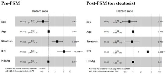 Screening stage: forest plot for Cox proportional hazards model before and after debiasing on steatosis. The (left) graph displays the hazard ratios for sex, age, steatosis, IFN, and baseline HBsAg level before matching. The (right) graph presents the same analysis, with steatosis treated as a strong covariate and balanced. Dotted vertical line represents a ratio of 1. The position of a black square is a point estimate of the ratio. **: p < 0.01 (highly significant); ***: p < 0.001 (extremely significant).