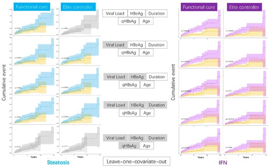 To validate the role of steatosis or IFN inclusion in achieving either a functional cure or HBsAg seroconversion, we conducted extensive validations using leave-one-covariate-out balancing in cumulative events analysis. IFN remained consistently significant. Steatosis also maintained its significance in most scenarios, except when age was the covariate being balanced, as shown in Figure 3. For exploratory purposes, we also plotted the age distribution among IFN users, stratified by HBeAg status and steatosis, with unbalanced cases and controls. We demonstrated that HBeAg-positive patients with early-onset steatosis might benefit more from IFN treatment (in-house data).