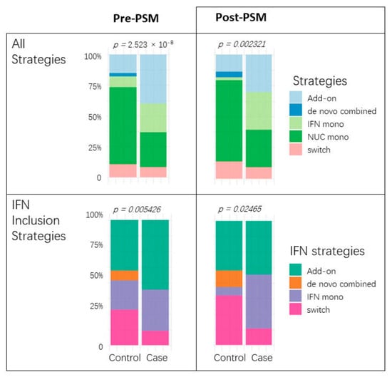 Antiviral strategy comparisons before and after PSM. Each paired bar plot illustrates the proportion of treatment choices between cases and controls. The (upper) two graphs encompass all choices, including NUC monotherapy, while the (lower) two focus solely on comparing IFN strategies.