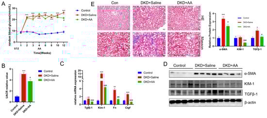 Protective effects of AA treatment on RBG, UACR, and renal phenotype in DKD. (A) Random blood glucose (RBG) in each group of mice. (B) UACR of mice in each group. (C,D) Alterations in renal indices after AA treatment. (E) Representative kidney histology showing HE and Masson stains (scale bar = 50 μm). *, p < 0.05; **, p < 0.01; ***, p < 0.001 vs. control. #, p < 0.05; ##, p < 0.01; ###, p < 0.001 vs. DKD + saline (n = 4).
