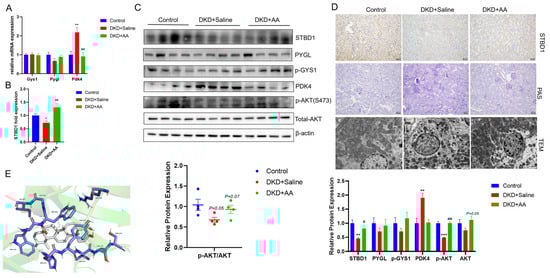 Compared to the DKD + saline group, no significant differences were observed in the expression of key proteins involved in glycogen synthesis, GYS1, or the classical cytoplasmic degradation pathway, PYGL, after AA treatment (Figure 2A,C). Notably, there was a pronounced upregulation of STBD1, a protein integral to an alternative glycogen degradation pathway (Figure 2B–D). Concurrently, we also identified alterations in the expression of PDK4, a critical nexus in glycolipid metabolism (Figure 2A,C). Western blot analysis further confirmed the activation of the AKT signaling pathway post AA administration (Figure 2C). In Figure 2D, AA treatments also improved the abnormal glycogen deposition in the kidney of DKD compared to DKD + saline. Synthesizing these observations, our results imply that the renoprotective action of AA might be mediated, at least in part, through the upregulation of STBD1 consequent to the activation of the AKT pathway. In addition, using STBD1 as the receptor and AA as the ligand, the molecular docking results showed an optimal binding energy of −7.129 kcal/mol, indicating good binding activity between the two. The interaction site is shown in Figure 2E.