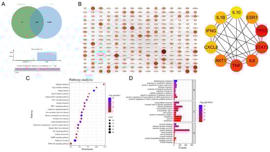 Network pharmacology of AA and DKD. (A) Venn diagram showing the intersection of genes related to AA and DKD. (B) PPI and core target. (C,D) Analysis of GO and KEGG enrichment.